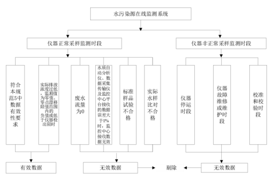 6.2.3 發現標準樣品試驗不合格、實際水樣比對試驗不合格時,從此次不合格時刻至上次校準校驗(自動校準、自動標樣核查、實際水樣比對試驗中的任何一項)合格時刻期間的在線監測數據均判斷為無效數據,從此次不合格時刻起至再次校準校驗合格時刻期間的數據,作為非正常采樣監測時段數據,判斷為無效數據。