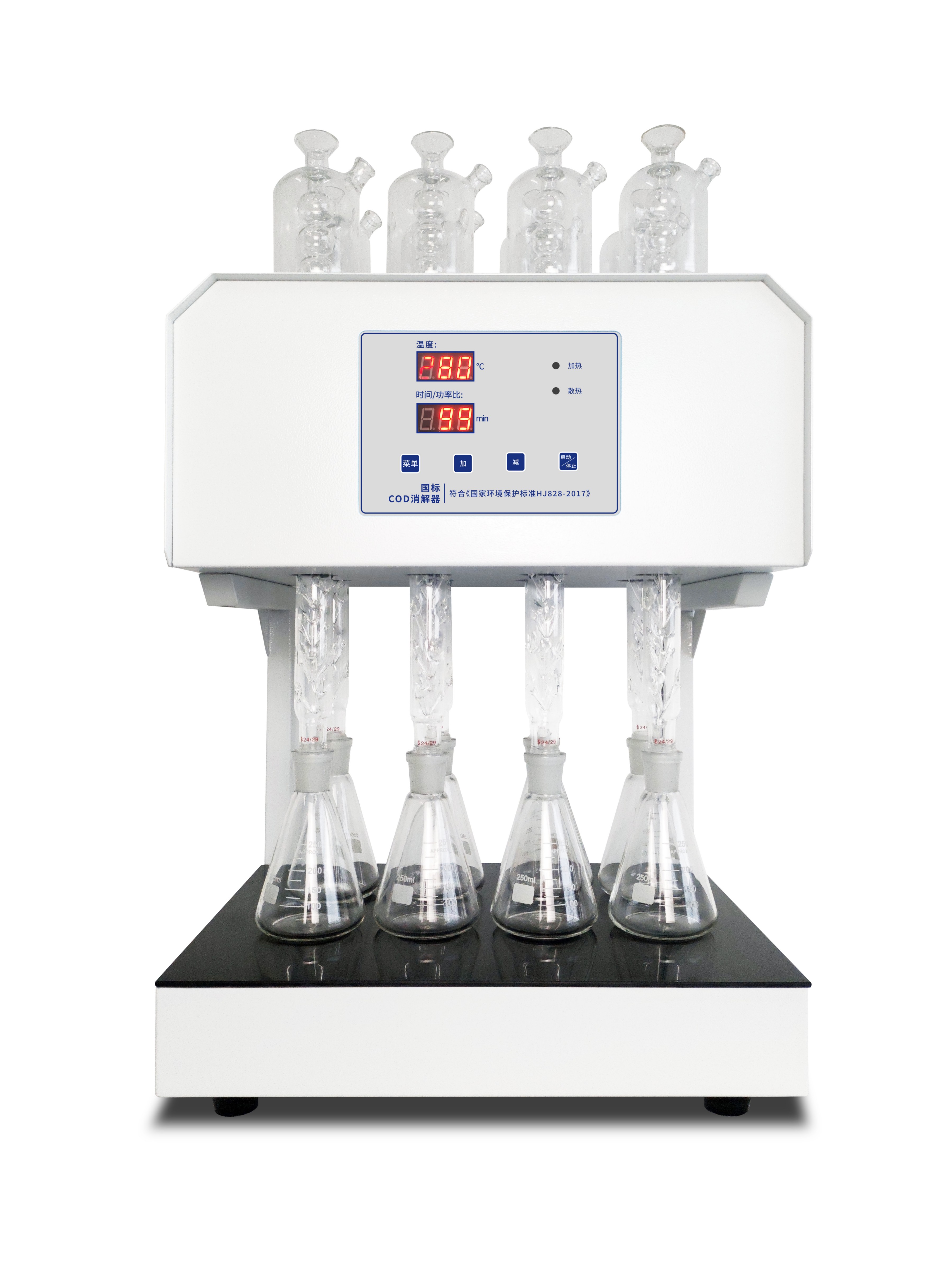 本儀器嚴(yán)格按照國家環(huán)保部標(biāo)準(zhǔn)分析方法《HJ 828—2017水質(zhì) 化學(xué)需氧量(COD)的測(cè)定 重鉻酸鹽法(代替GB 11914-89)》規(guī)定的測(cè)定步驟,規(guī)定了方法的加熱消解時(shí)間、溶液酸度、氧化劑和催化劑的用量等條件指標(biāo)。遵循國際標(biāo)準(zhǔn)(ISO)和國家標(biāo)準(zhǔn)(GB)的基本原則,保證回流加熱微沸2小時(shí)的消解操作,試劑溶液的配制和加入量符合國家環(huán)保部《HJ828-2017》重鉻酸鹽法,確保可靠精確的分析結(jié)果。儀器的基本參數(shù)